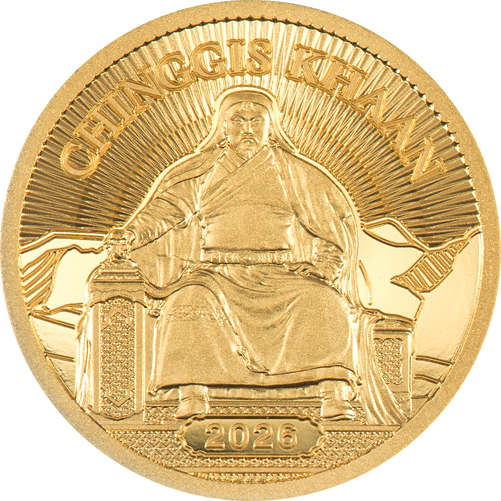 Diese aussergewöhnliche Münzserie würdigt Chinggis Khaan, den Begründer des Grossen Mongolischen Reiches. Kraftvoll thronend dargestellt, beeindruckt das Motiv durch fein ausgearbeitete Details, präzise Gewandstrukturen und ein kunstvoll gestaltetes Thronornament, umgesetzt in modernster Hochrelief-Prägetechnik.