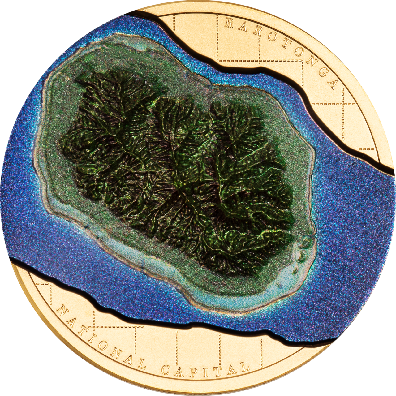 Das kunstvolle Motiv zeigt die Insel Rarotonga in eindrucksvollem Ultra-High-Relief, geprägt mit modernster smartminting®-Technologie und veredelt durch eine farbenprächtige Gestaltung, die die tropische Landschaft im warmen Licht der Südsee erstrahlen lässt. Palmen, türkisblaues Wasser und die markante Silhouette der Insel fangen den Zauber der Cook Islands perfekt ein.