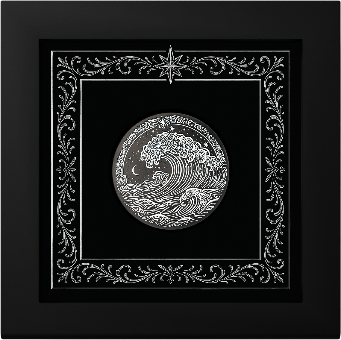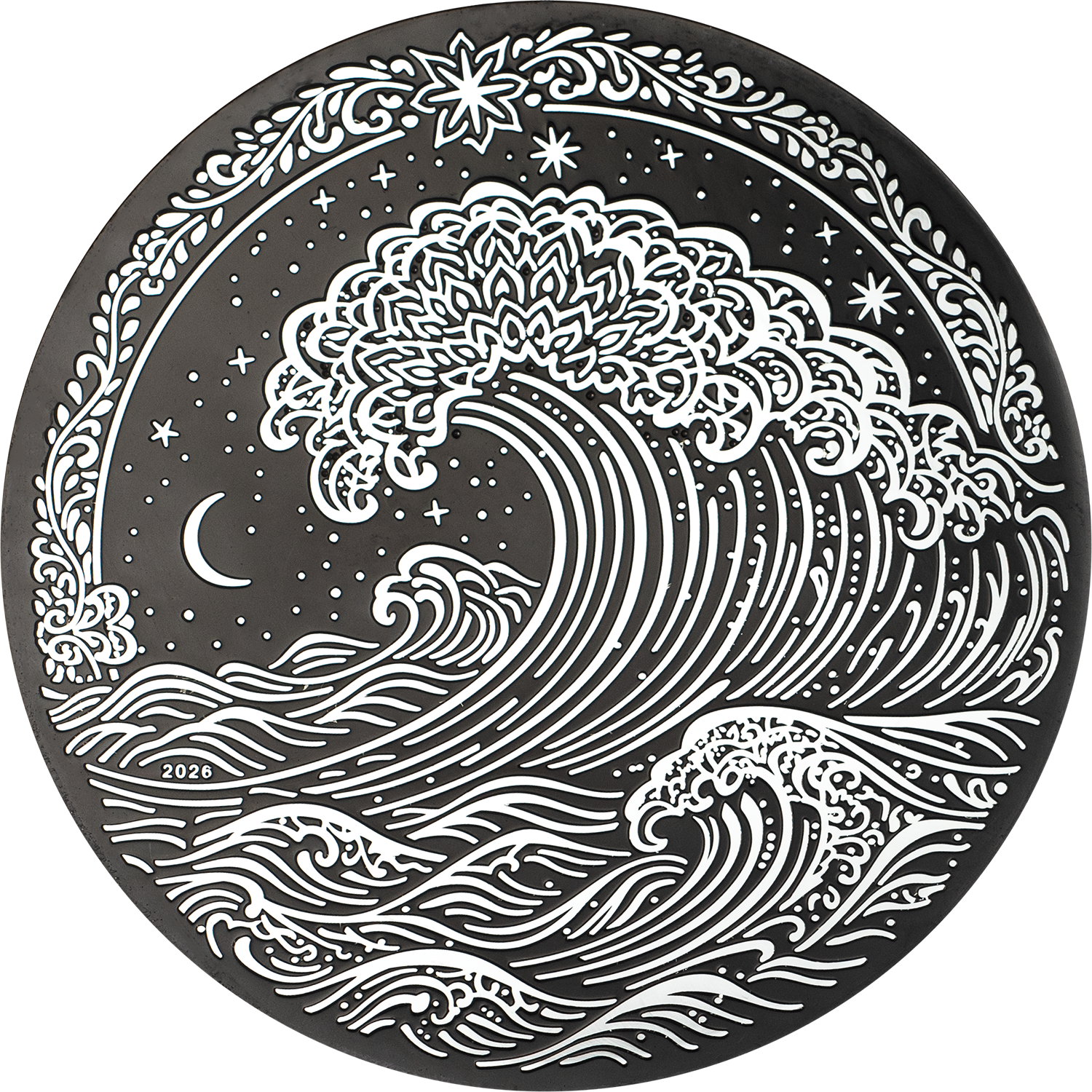 Die Kombination aus dunkler Tiefe und glänzender Linienführung verstärkt den Eindruck von Bewegung, als würde die Welle im nächsten Moment brechen. Diese moderne Interpretation verbindet klassische Kunst mit zeitgemässer Prägetechnik und schafft ein eindrucksvolles Zusammenspiel aus Tradition und Innovation.