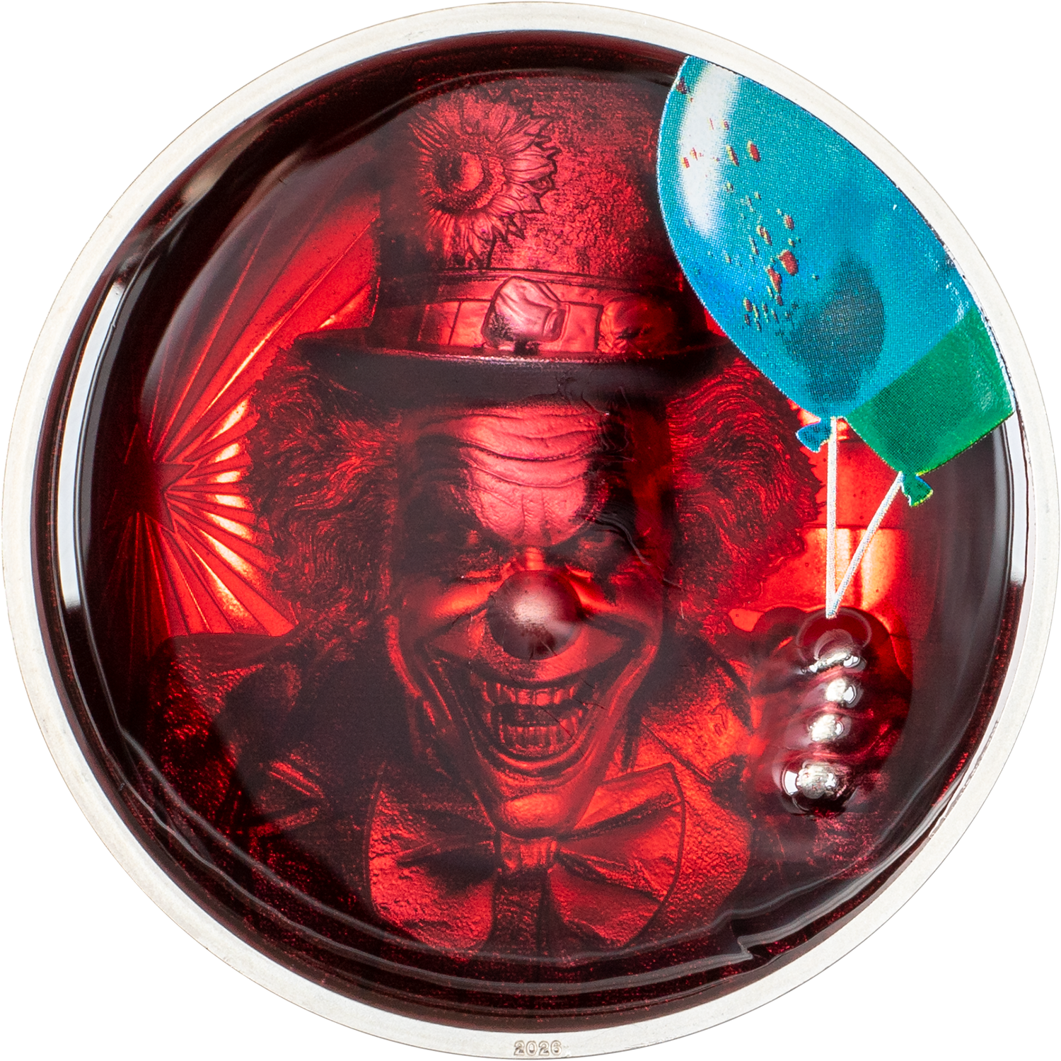 Diese eindrucksvolle 2-Unzen-Silbermünze fängt diese beklemmende Atmosphäre meisterhaft ein. Das ultrahohe Relief verleiht dem Motiv eine beeindruckende Tiefe, während Emaille und intensive Farbgebung den Clown lebendig wirken lassen, fast so, als würde er im nächsten Moment aus der Münze hervortreten.