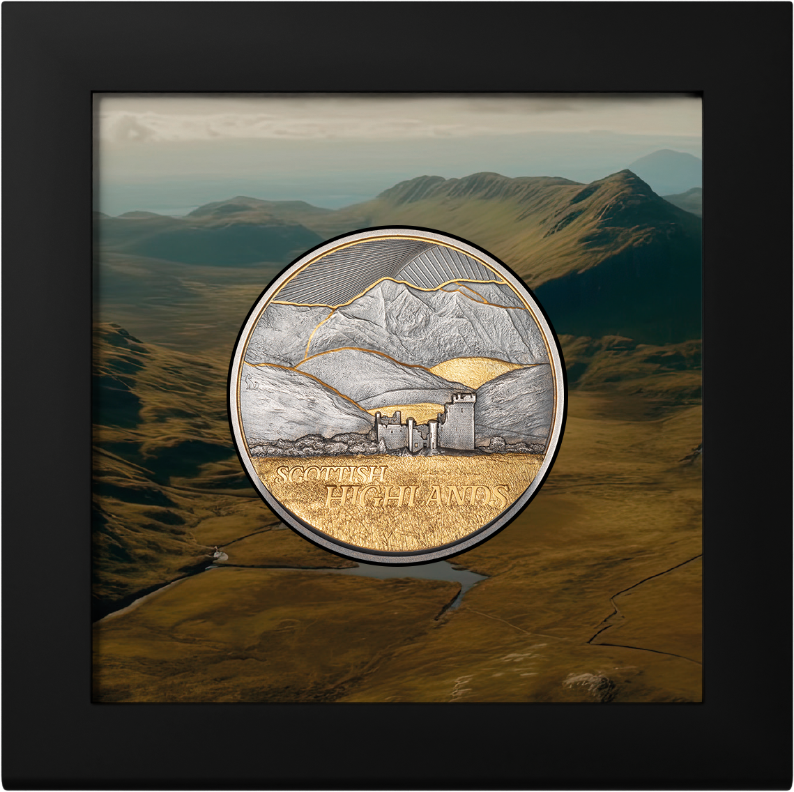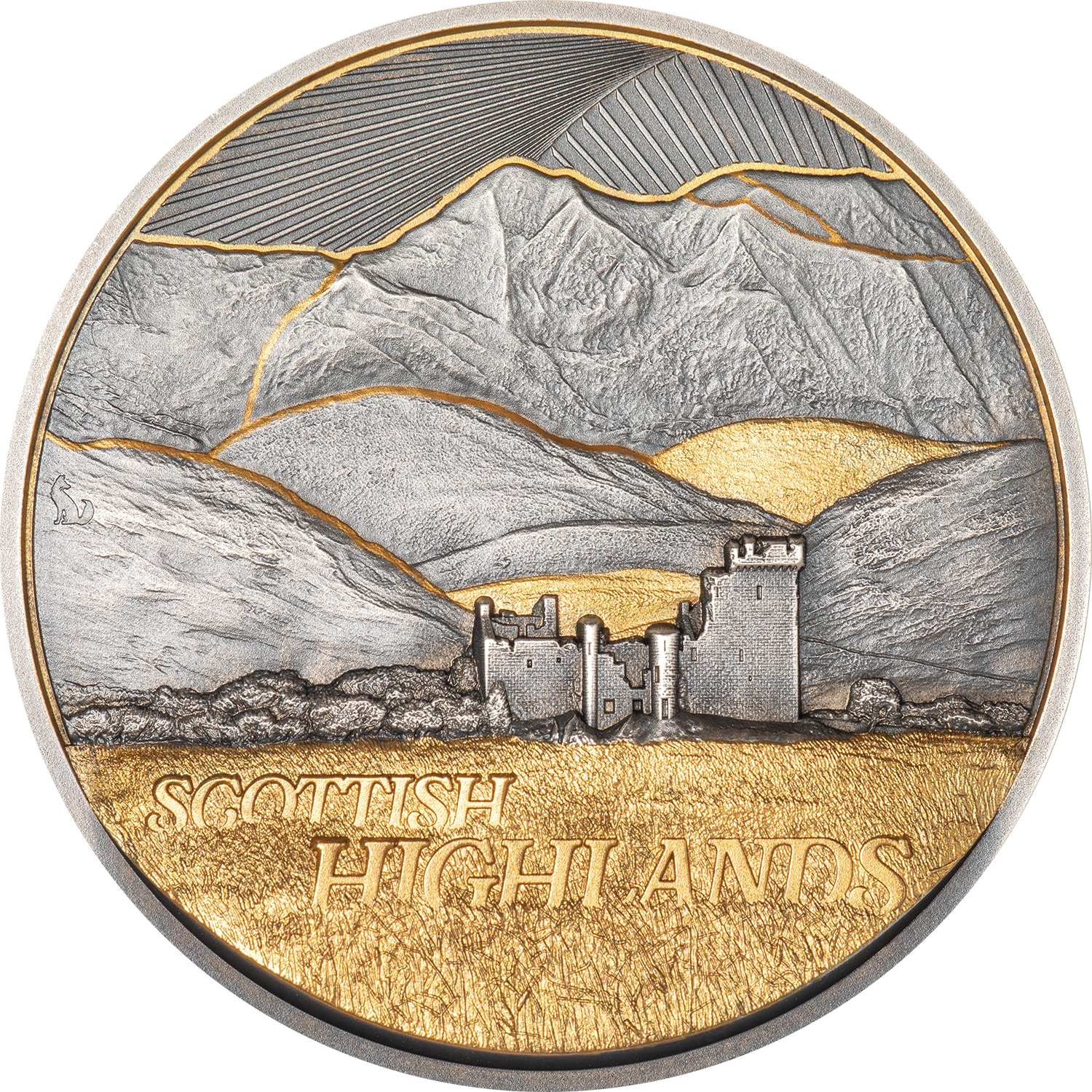 Die Münze greift diese besondere Atmosphäre gestalterisch auf und setzt die Landschaft in einer detailreichen Komposition um. Durch den Einsatz von ultrahohem Relief entsteht eine ausgeprägte Tiefenwirkung, die das Motiv besonders plastisch erscheinen lässt. Die Kombination aus Antique Finish, gezielter Befärbung und Teilvergoldung hebt einzelne Elemente hervor und sorgt für ein harmonisches Gesamtbild.