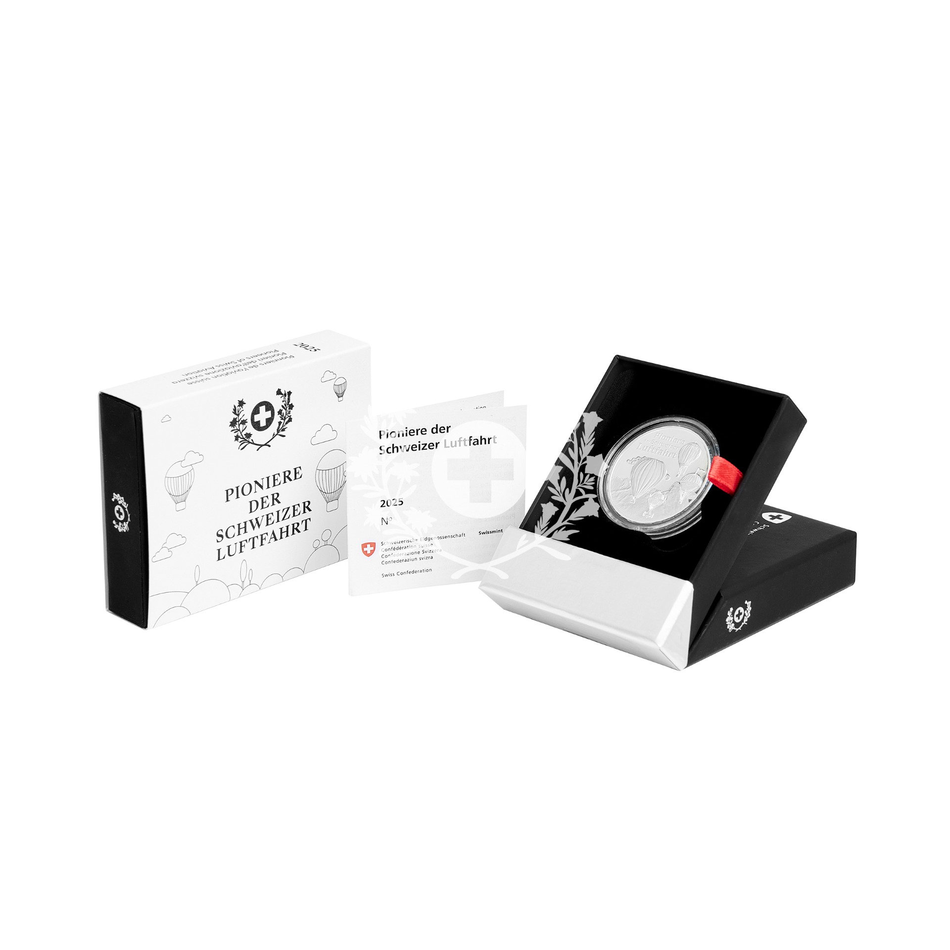 Den Auftakt macht die 20-Franken-Münze «Pioniere der Schweizer Luftfahrt», die den Beginn der Eroberung des Himmels erzählt. Die Münze ist aus reinem 999er-Silber geprägt, wiegt 20 g und misst 33 mm im Durchmesser. Auf der Bildseite sind verschiedene Ballone vor der Bergkulisse des Saanenlands dargestellt, begleitet vom Schriftzug «Pioniere der Schweizer Luftfahrt».